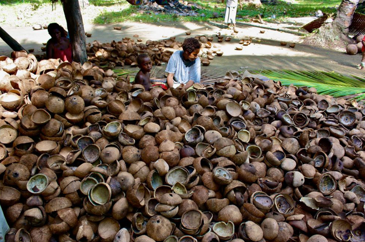 Copra is dry coconut. Every part of the coconut tree is put to some use in Kerala. Her long leaf cluster is used to thatch roofs, her wood is used for making furniture, the coconut shell is used for burning, her husk is immersed in water and yields the fibers that are spun together to make coir, her scalp is used in cooking and when dried yields a cooking medium called coconut oil .